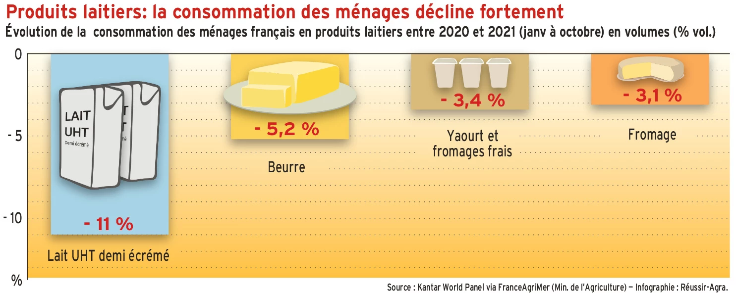 Les volumes de produits laitiers consommés par les ménages français sont en fort recul sur l'année 2021, particulièrement pour le lait UHT demi-écrémé et le beurre. Les prix des produits ont globalement augmenté : + 2,6 % pour le lait demi-écrémé, + 1,1 % pour les yaourts et les fromages frais et + 1,3 % pour le fromage. Le prix du beurre recule, lui, de 1,6 % d'après les chiffres de FranceAgriMer.