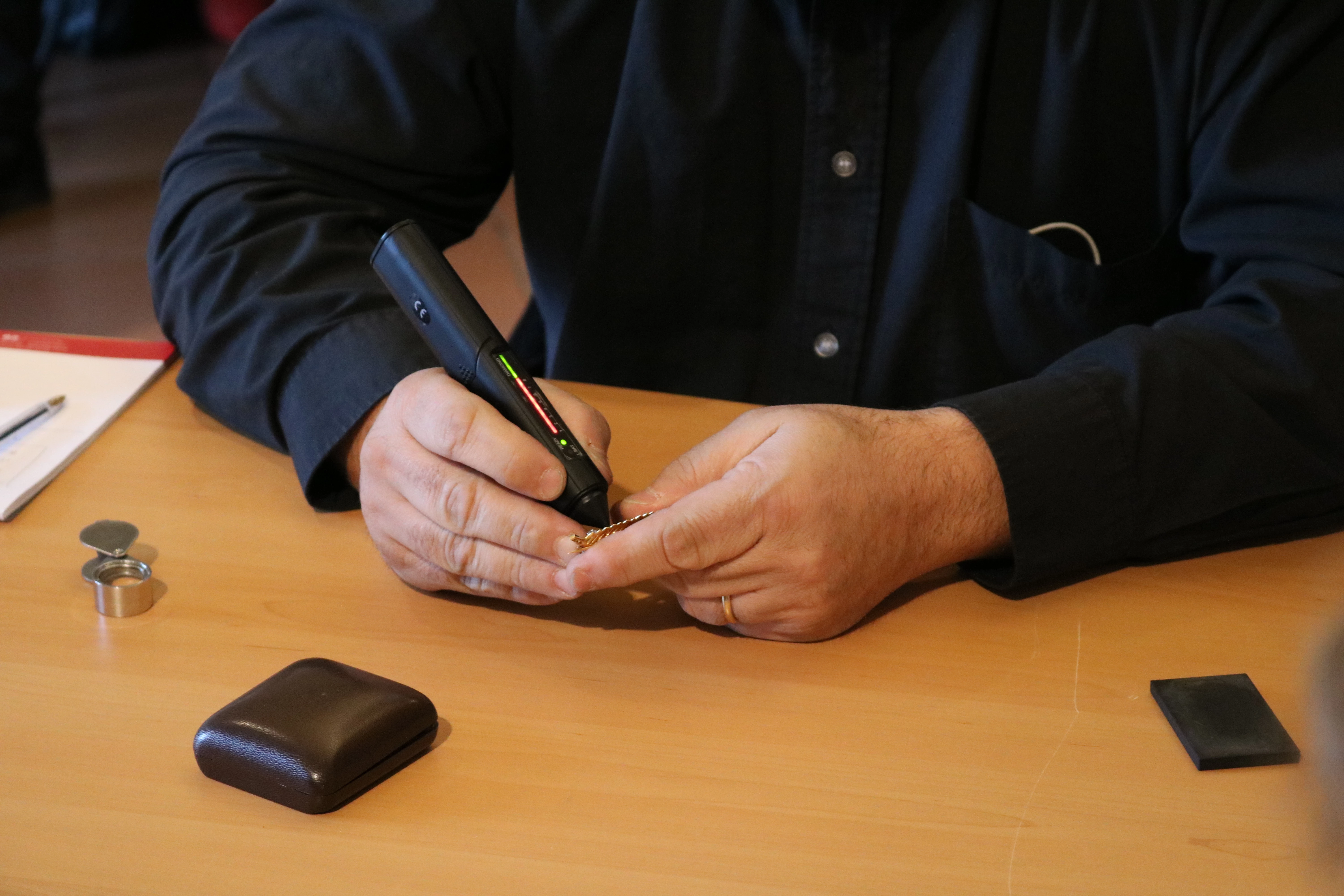 Pour Danielle, en revanche, c’est une première. Elle est venue avec des bijoux sur lesquels Laurent Aubanel démontre son expertise. Faute de trouver le poinçon officiel attestant de leur teneur en or, il la détermine à l’aide d’acides, détaillant son intervention pas à pas. Quelques minutes plus tard, le professionnel emploie un stylet pour s’assurer qu’il s’agit bien de diamants. Si la Montbrisonnaise ne lui confie finalement qu’une broche, elle repart ravie : « Je voulais voir comment cela se passait et c’était très intéressant. J’ai découvert des choses sur l’histoire de mes bijoux, dont je souhaitais connaître la valeur, plus à titre d’information que dans l’optique de les vendre. Cela permet de se faire une idée. »