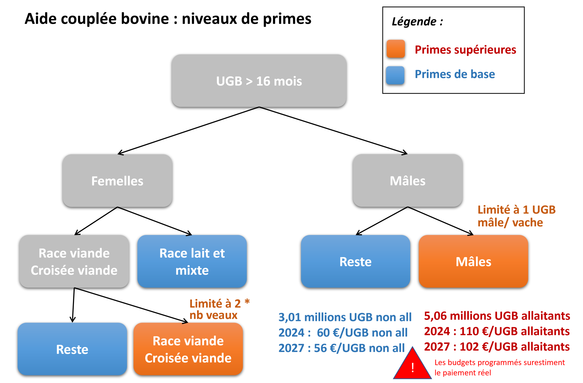 - niveau supérieur (environ 110 €/UGB) pour les UGB liées aux femelles de races allaitantes dans la limite de deux fois le nombre de veaux nés et détenus 90 jours, ainsi qu’aux mâles sans distinction de races dans la limite du nombre de vaches présentes sur l’exploitation ;
