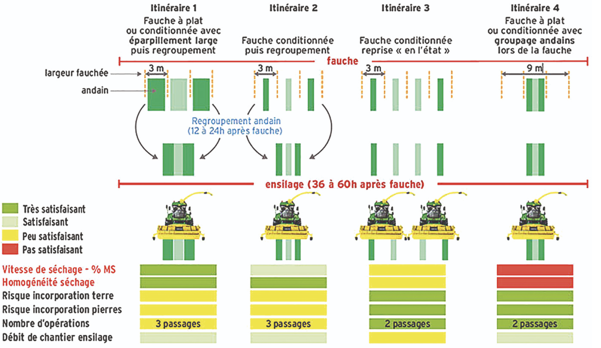 Ensuite, le type de faucheuse présente son lot d’avantages et d’inconvénients (voir illustration). L’utilisation d’une faucheuse-conditionneuse a l’avantage d’enchaîner trois opérations en une (fauche – conditionnement – mise en andains). La reprise directe des andains par le pick-up de l’ensileuse est alors possible. Dans ces situations, il est intéressant d’élargir les andains pour profiter d’une surface d’exposition plus importante tout en restant compatible avec la largeur du pick-up de l’ensileuse. Mais les andains resteront "étroits"(~30 à 40 % de la surface fauchée).