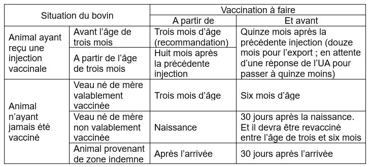 Le tableau ci-contre répertorie les situations possibles des bovins et les règles vis-à-vis de la vaccination.