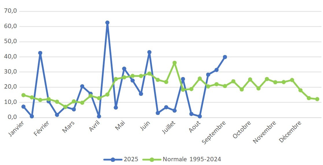 Du début de l’année 2025 jusqu’à la première décade de juin, des cumuls pluviométriques réguliers ont été relevés, favorables aux pousses printanières. Ensuite, un déficit pluviométrique s’est installé entre la 2e décade de juin et la 2e de juillet. Ce n’est que vers le 20 juillet que des pluies ont apporté un peu de répit à la végétation et aux agriculteurs. Puis, début août, un nouveau déficit hydrique a été observé. A partir du 19 août, des pluies ont contribué à détendre la tension.