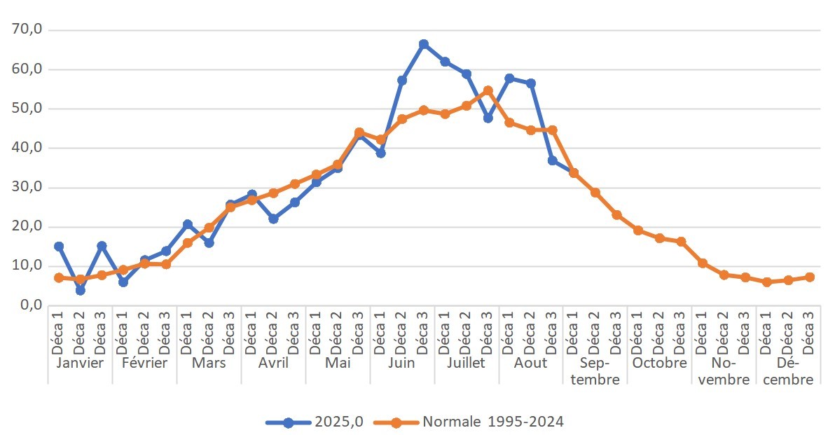 En effet, du début de l’année jusqu’à début juin, l’ETP relevée est restée très proche de la normale. A contrario, les ETP observées de mi-juin à mi-août ont été très supérieures aux normales (excepté la dernière décade de juillet), lesquelles ont généré deux périodes de déficit hydrique intenses (juin-juillet et août). Le graphique 2 compare les ETP de 2025 à celles de la normale.