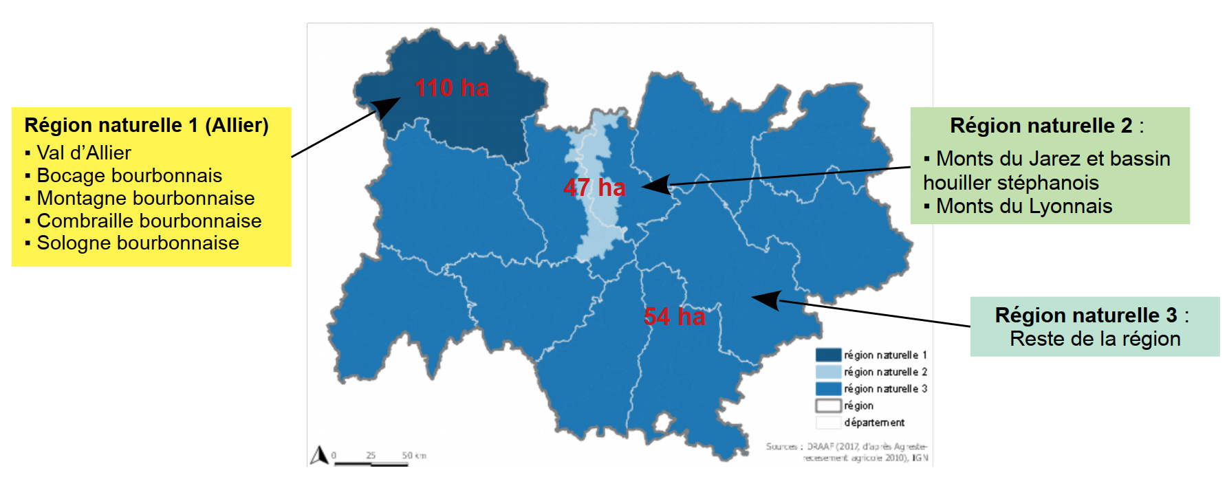 Le département de la Loire présente deux seuils de contrôle des structures : 47 ha pour les monts du Lyonnais, le Jarez et le Stéphanois, 54 ha pour le reste du département. Pour l’atteinte de ces seuils, une pondération (équivalences de production) s’applique pour les productions végétales, en particulier pour les cultures pérennes ou les cultures spécialisées, et pour les productions animales hors-sol.