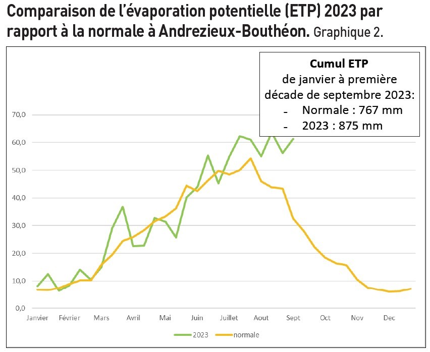 Après une année climatique 2022 caractérisée comme très sèche, l’hiver 2022-2023 a suivi la même tendance jusqu’à début mars. Ce n’est que durant la deuxième décade de mars qu’a été relevée une pluviométrie supérieure à la normale. Ensuite, la pluviométrie décadaire est restée proche mais inférieure à la normale, et même déficitaire durant la dernière décade de mai. Au mois de juin, la station d’Andrézieux-Bouthéon a relevé une pluviométrie très supérieure à la normale (114 mm alors que la norme est de 76 mm). Durant l’été, la pluviométrie est restée toujours déficitaire par rapport à la norme.